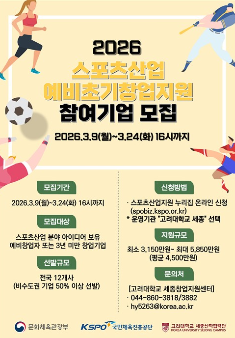 高丽大学世宗校区(副校长 梁智云)世宗产学合作团表示,将于3月9日至3月24日下午4点,招募参与“2026年体育产业预备及初创企业支持项目”的创业企业。