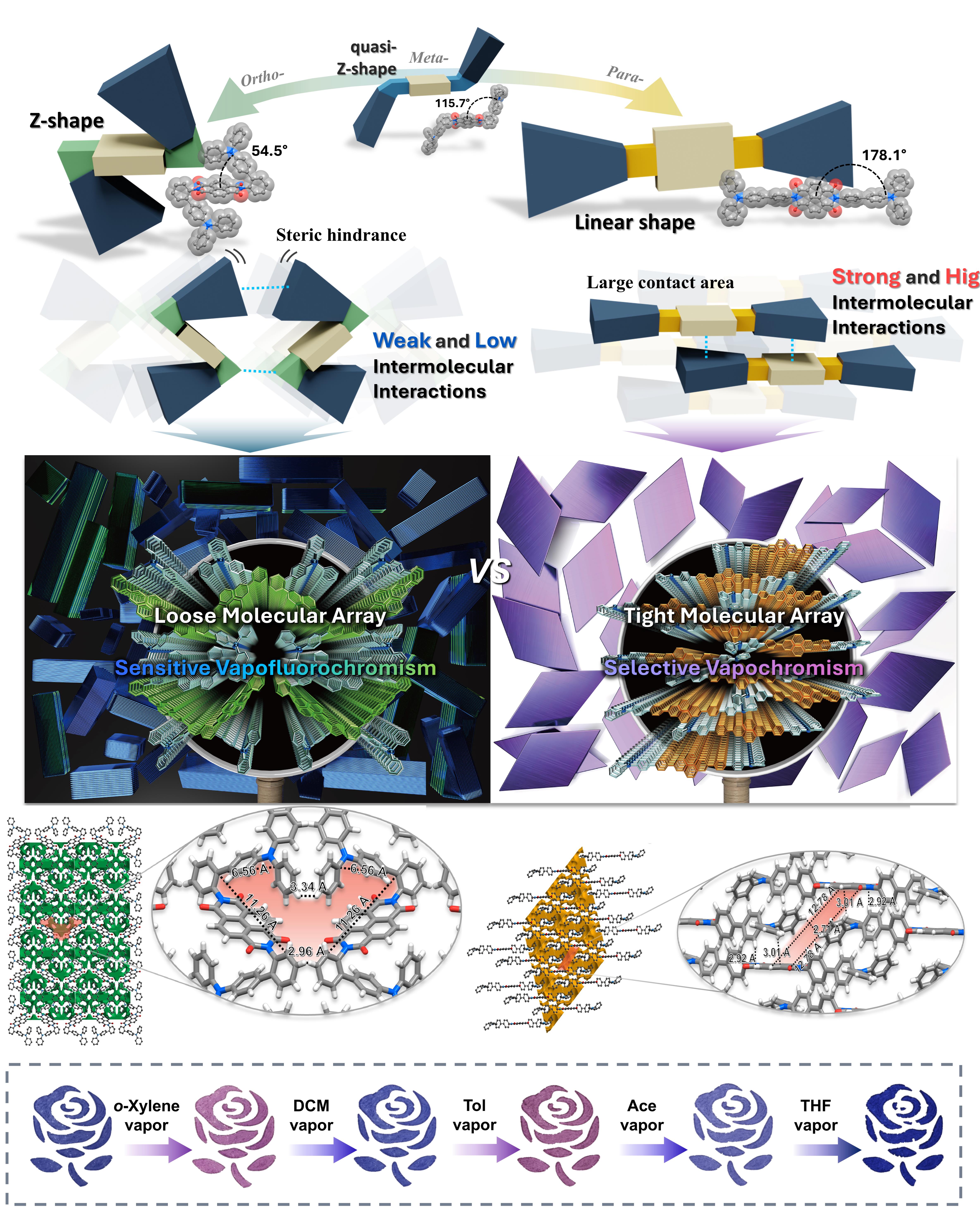 이를 극복하기 위해 연구팀은 위치 이성질체를 사용하여 도너-억셉터-도너 (Donor–Acceptor–Donor) 기반 분자 빌딩 블록의 모양을 조작하여 분자 배열을 제어하는 전략을 제시하고 분자 배열과 증기 변색성 간의 상관관계를 규명해 냈다.